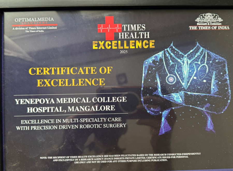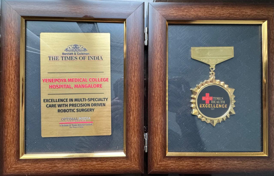 Yenepoya Medical College Hospital has been honoured with the Award for Excellence in Multispecialty Care with Precision-Driven Robotic Surgery at the Times Health Excellence 2025. The award was received by Dr. M. Vijay Kumar, Hon. Vice Chancellor, Yenepoya (Deemed to be University), at the ceremony held on December 4, 2025, at the JW Marriott Hotel, Bengaluru.